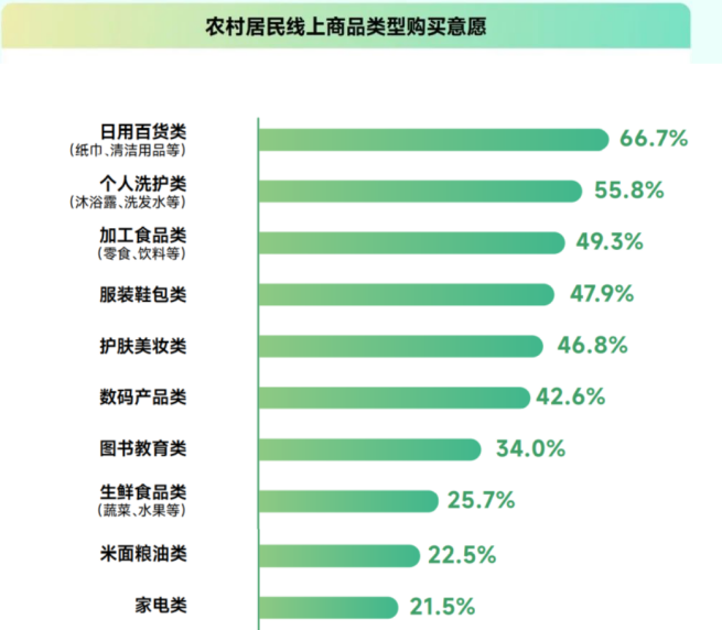 根据巨量算数发布的《2022年移动互联网农村消费振兴研究报告》显示,截止2022年6月,农村手机网民规模为3.48亿,占农村常住人口的69.78%;其中网购用户为2.75亿,占比55.14%。质量和价格是农村用户购物最关心的因素;日用品、个护用品、美妆护肤用品在网购意愿中是排名前五的品类。