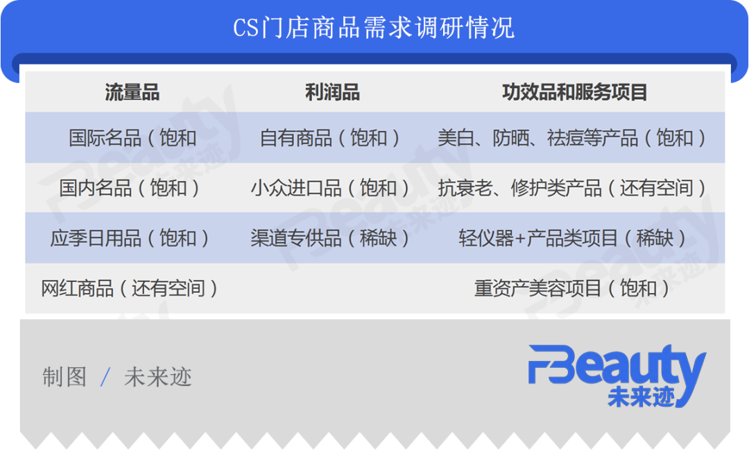 从供给侧分析,传统的基础功效产品在CS渠道的供应已经过剩;单纯从渠道商的需求角度出发开发的商品,也已经在过剩;有明确而科学的起效机理,有良好背书的功效型产品以及结合轻仪器的项目,仍然有空缺;基于对下沉市场消费人群的需求洞察,兼顾渠道商需求开发的商品,并且围绕下沉市场消费者进行针对性营销的品牌目前非常稀缺。