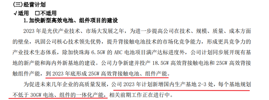 在爱旭股份2022年财报中,就有这样一段话——公司到2023年底将形成25GW高效背接触电池、组件产能,同时,计划在2023年新增国内生产基地2-3处,每个基地规划不低于30GW电池、组件的一体化产能。