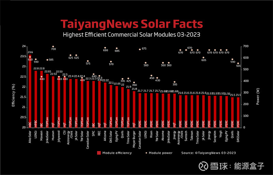 今年3月17日,TaiyangNews更新了Top Module List(组件排名),排名第一的便是爱旭股份推出的量产效率高达23.6%的ABC白洞系列背接触组件。而此前,排名量产组件效率第一的是隆基绿能与新加坡光伏企业Maxeon,两者量产效率皆为22.8%。