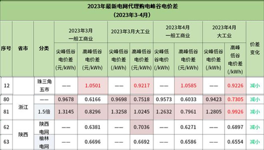 2023年4月,广东珠三角五市的大工业高峰低谷电价差达到了0.92元/kwh,浙江大工业高峰低谷电价差为0.73元/kwh(执行1.5倍购电的话,浙江大工业高峰低谷电价差甚至可以达到0.99元/kwh)。