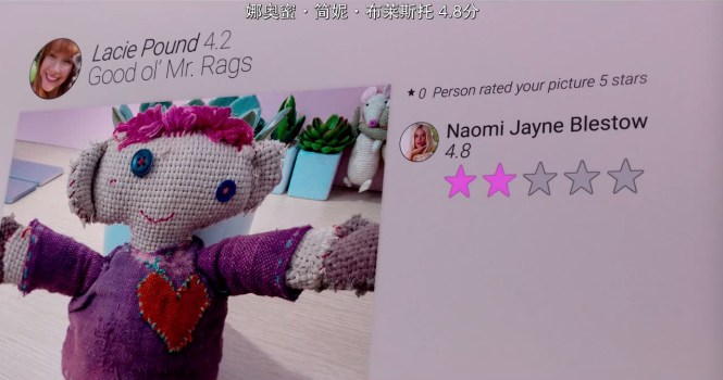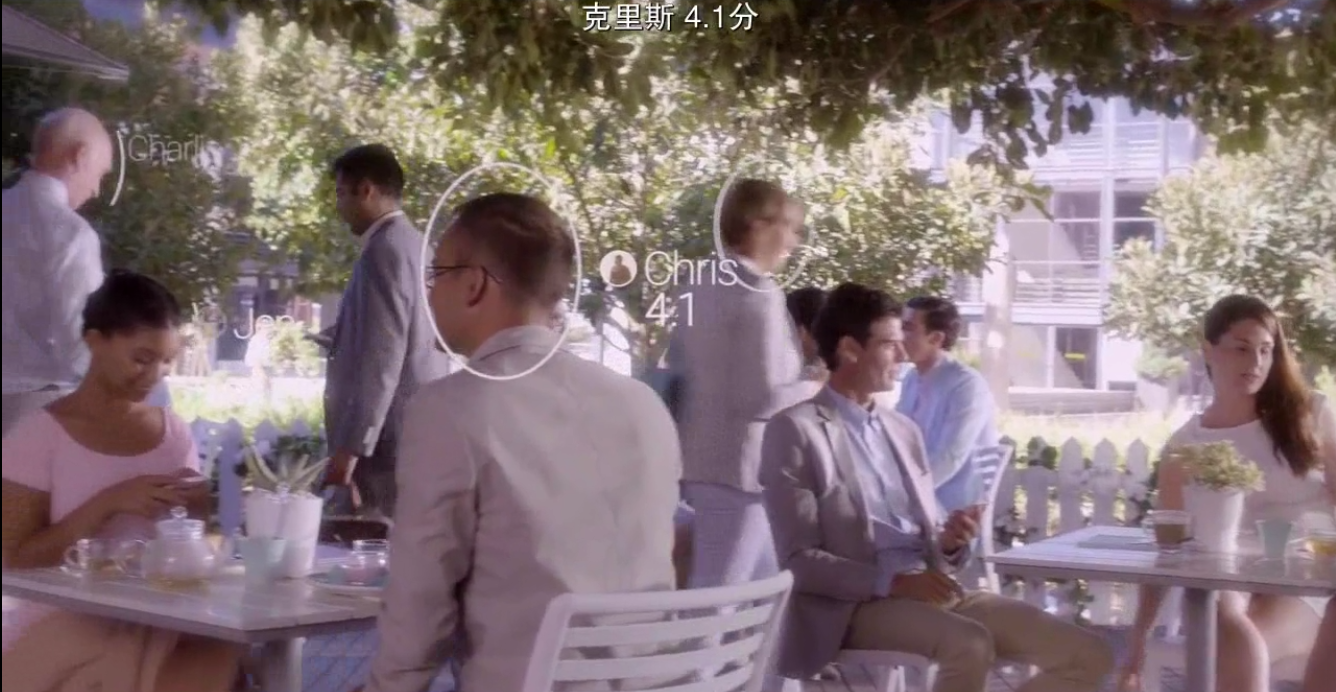 同样通过AR显示在每个人面孔旁的,还有一个分数。这个世界存在一个评分系统,当你和任何人产生任何社交行为后,都需要通过手中的终端系统为其评分。分数从1-5,代表着你对这个人的印象。在这个世界,评分系统已经是一套历史悠久的制度,它和各项社会福利挂钩。通常4.5分以上的人被认为是高分人群,他们可以享受到更多优先的社会资源,比如租房福利、机场快速通道、更优质的教育和医疗服务等等。而低于2.5分的人,即使健康健全也会被看做异类,失去工作和住房,被整个社会体制抛弃。