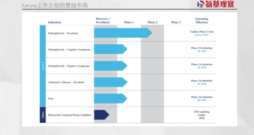 但美股biotech,更多的答案是,在一个领域豪赌,管线相对单一。事实告诉我们,这并不妨碍市场对这些管线单薄biotech的认可。比如今天的主角,Karuna。