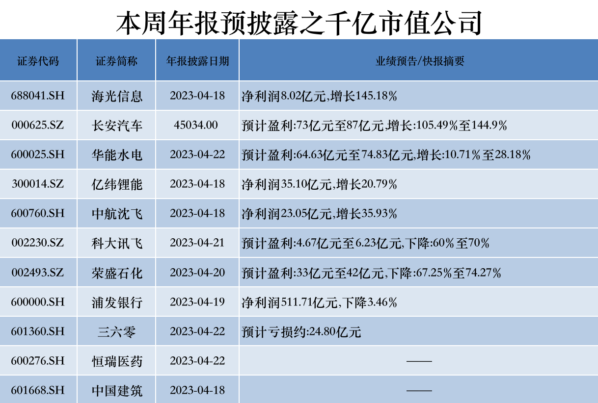 有11家千亿市值公司将于本周披露年报,其中9家已披露业绩预告或业绩快报。