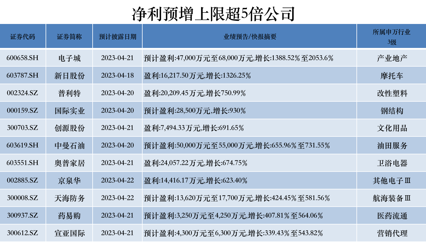 11家公司预告净利增幅上限超5倍,其中电子城(600658.SH)、新日股份(603787.SH)最大增幅分别高达20.54倍和13.42倍。