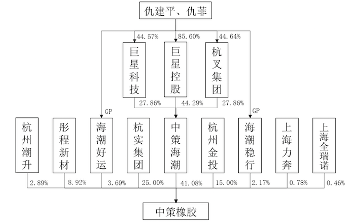 而仇建平还是巨星集团、杭叉集团(603298)和巨星科技(002444)的实际控制人,通过中策海潮控制了中策橡胶41.08%的股份及相应表决权,并担任公司董事职务;同时仇建平作为海潮好运、海潮稳行的执行事务合伙人,控制了发行人合计5.87%的股份及相应表决权。因此,仇建平和仇菲合计控制中策橡胶46.95%的股份及相应表决权,是公司的实际控制人。
