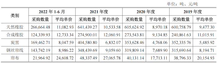 2021年,天然橡胶采购平均单价为10533.58元/吨,较2020年8970.18元/吨上涨17.43%;合成橡胶平均单价12060.91元/吨,较2020年9134.85元/吨上涨32.03%。