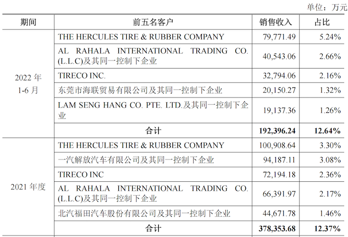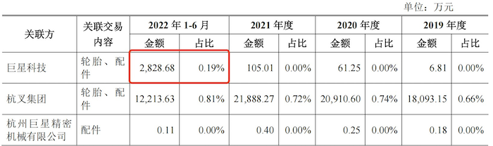 招股书显示,2021年公司向巨星科技销售轮胎、配件金额为105.01万元,与巨星科技披露年报中采购中策橡胶配件及维修费105.01万元一致。但2022年上半年,公司向巨星科技销售轮胎、配件2828.68万元。然而巨星科技2022年半年报显示采购中策橡胶配件及维修费用金额仅27.42万元,出现较大差额。
