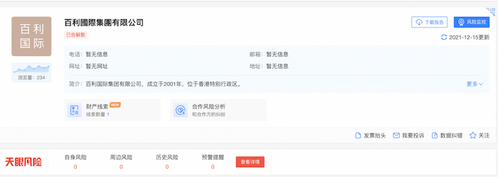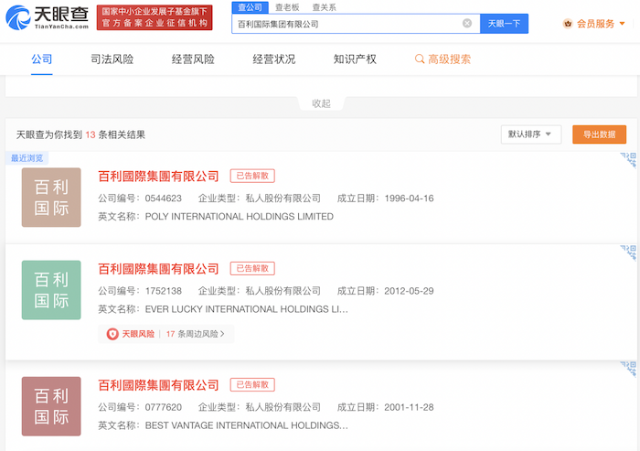 值得注意的是,界面新闻从天眼查搜索第一大供应商百利国际集团有限公司,共出现3个结果,3家公司均显示已告解散。