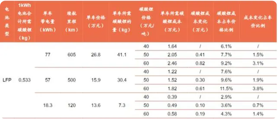 碳酸锂价格变动与新能源汽车的成本、利润空间息息相关。通常来说,锂电池成本占到整车40%左右。若装车电池为LFP(就是磷酸铁锂电池),单车带电分别为77kWh(高端纯电),57kWh(中端纯电)以及18.3kWh(混动),在碳酸锂价格为50万元/吨时,单车碳酸锂成本分别为2.05万元,1.52万元和0.49万元,占车价的比重为7.7%、9.6%和3.6%。按这一数字测算,当碳酸锂价格下降30万元后,以纯电车为例,对应的碳酸锂材料成本降低约1.23万元。