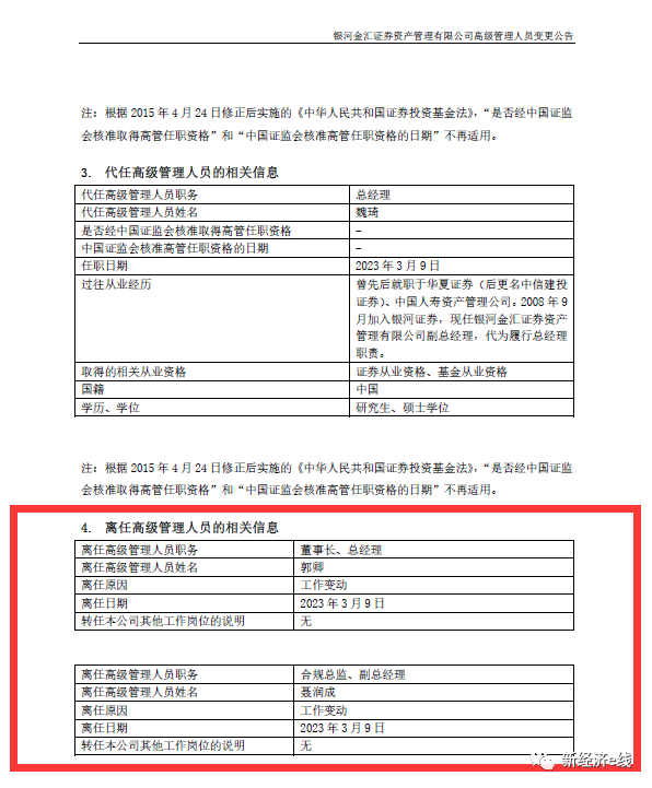 据新经济e线了解,在公募机构总经理人员变动中,郭卿无疑是任职时间最短的一位,仅短短几个月时间。今年3月11日,作为银河证券全资子公司的银河金汇资管发布多名高管变动消息。其中,郭卿因工作变动离任董事长、总经理职务;聂润成因工作变动离任合规总监、副总经理职务。杜鹏飞履新公司董事长,潘多亮新任合规总监、首席风险官;副总经理魏琦代任总经理职务。