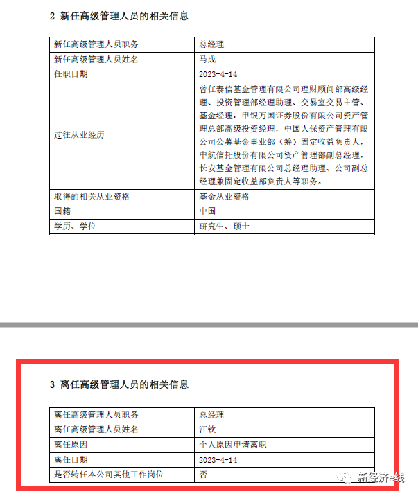 作为长安基金第4任总经理,汪钦之前的三任公司总经理分别为曹阳、黄陈、袁丹旭。其中,袁丹旭同样因个人原因于2020年10月16日申请离任。彼时,由时任董事长万跃楠暂代总经理一职,直至汪钦到任。