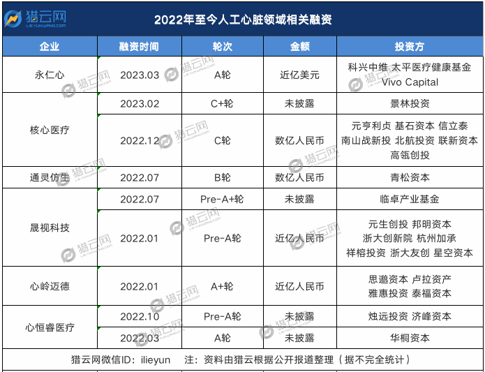 近两年,国内多家人工心脏企业获得了顶尖资本的加持,市场上多家人工心脏相关品牌完成融资,包括核心医疗、同心医疗、心擎医疗等都获得过数亿元投资,红杉中国、中金资本、鼎晖投资等机构争相涌入这一赛道。