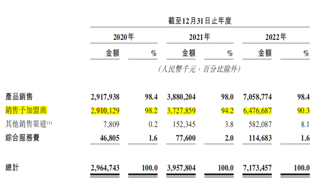 显然这些加盟商成为了撑起锅圈盈利的关键因素,从销售渠道收入来看,2020年-2022年,锅圈从加盟店渠道获得的收入分别为29.1亿元、37.3亿元以及64.8亿元,连续三年占比都超过90%。也就意味着,锅圈业绩严重依赖加盟门店的扩张和销售情况。
