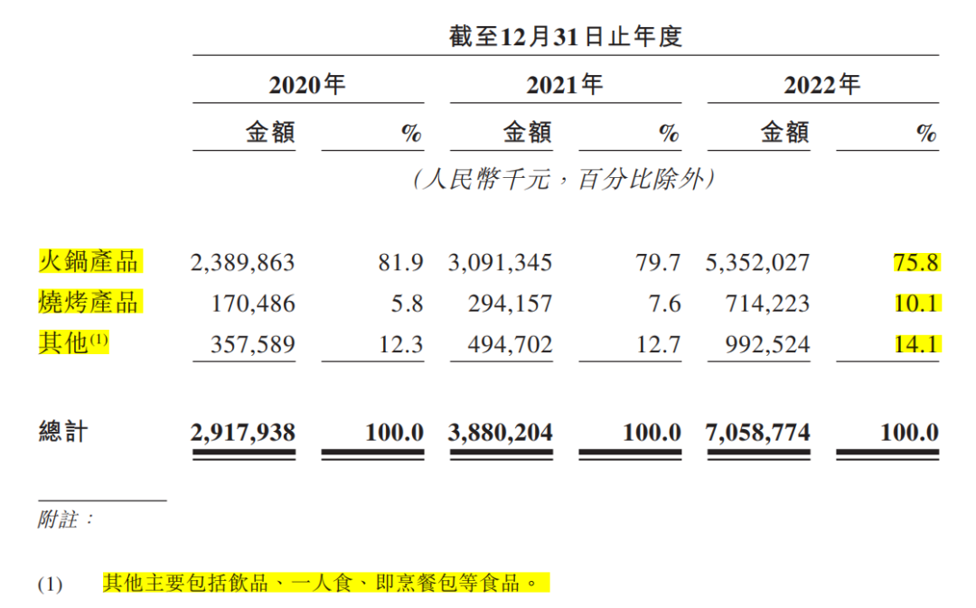 我们先来看产品和习惯层面,仔细研究招股书就不难发现,火锅产品为锅圈贡献了近8成的收入,其2022年带来收入53.5亿元,占比75.8%;其次才是其他产品(饮品、一人食、即烹餐包等),营收为9.9亿元,占比14.1%;最后是烧烤产品,营收7.1亿元,占比10.1%。