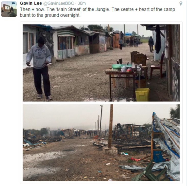 路透社报道称,三天的拆除工作进行得很顺利,只有少量难民点燃了营地里的帐篷以示抗议。加莱地区政府负责人布齐奥(Fabienne Buccio)则宣布:“这就是‘丛林’的终结。任务完成,难民营里已经没有难民了。”