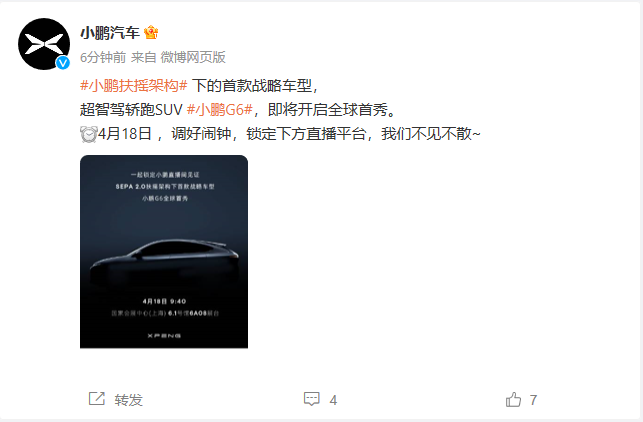 据小鹏汽车官方微博4月17日消息,小鹏扶摇架构下的首款战略车型超智驾轿跑SUV小鹏G6将于4月18日9时40分首发。