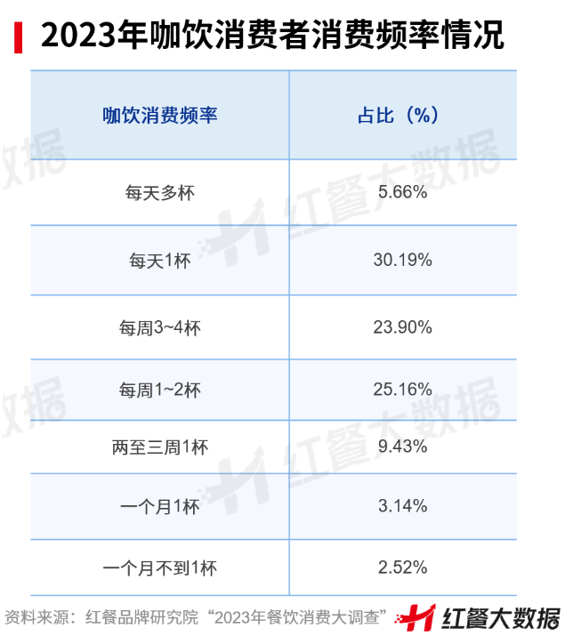 在这个过程中,咖啡越来越普及,逐渐从一种小资的生活方式变成消费者的生活日常。红餐品牌研究院“2023年餐饮消费大调查”显示,在受访咖饮消费者中,每周至少饮用一杯咖饮的受访者达到了84.91%,其中每天至少饮用一杯咖饮的消费者超过了35%。