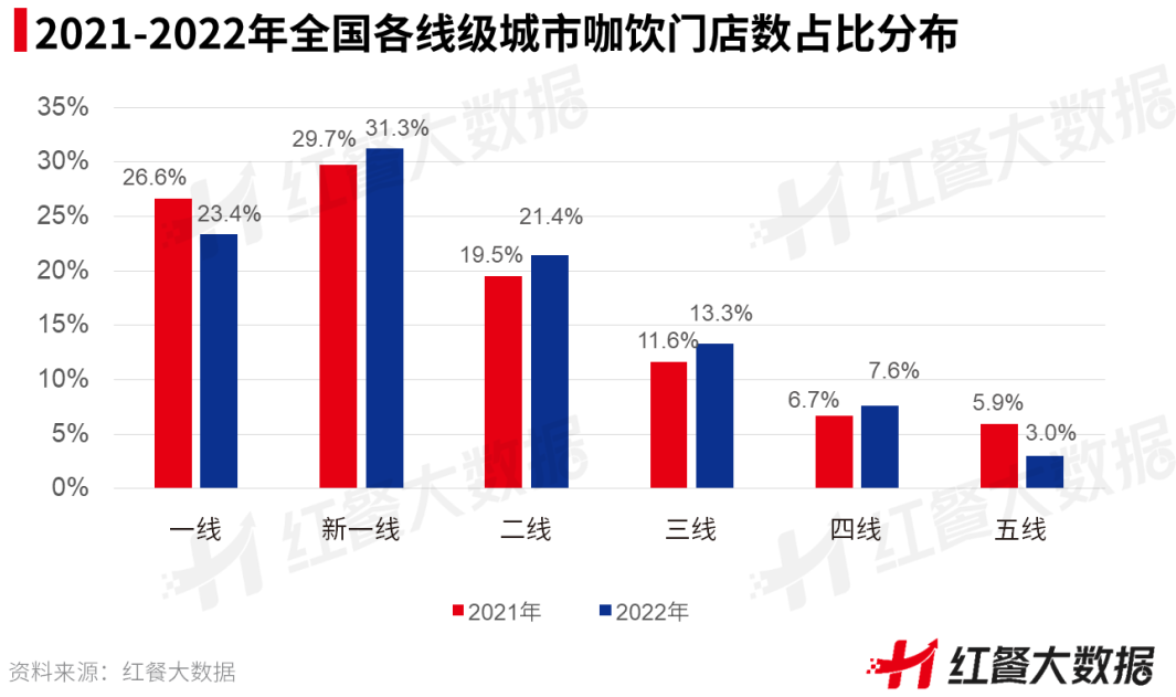 红餐大数据显示,相较2021年,2022年新一线城市及二三四线级城市的门店数占比均有所提升。可见,下沉市场的咖饮门店增速较快,市场发展潜力大。