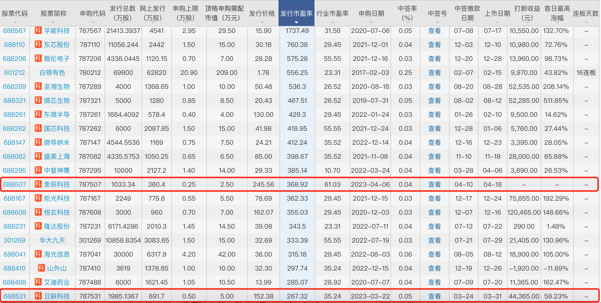 无独有偶。3月22日申购,3月31日上市的日联科技(688531.SH)同样以267.32倍的发行市盈率,跻身历史前列,其所处行业市盈率为35.24倍。日联科技的发行价152.38元,同样不低。日联科技网上发行最终中签率为0.04795068%,同样也有网上弃购,弃购数量130.8088万股,网上弃购金额1.99亿元,比索辰科技还多。