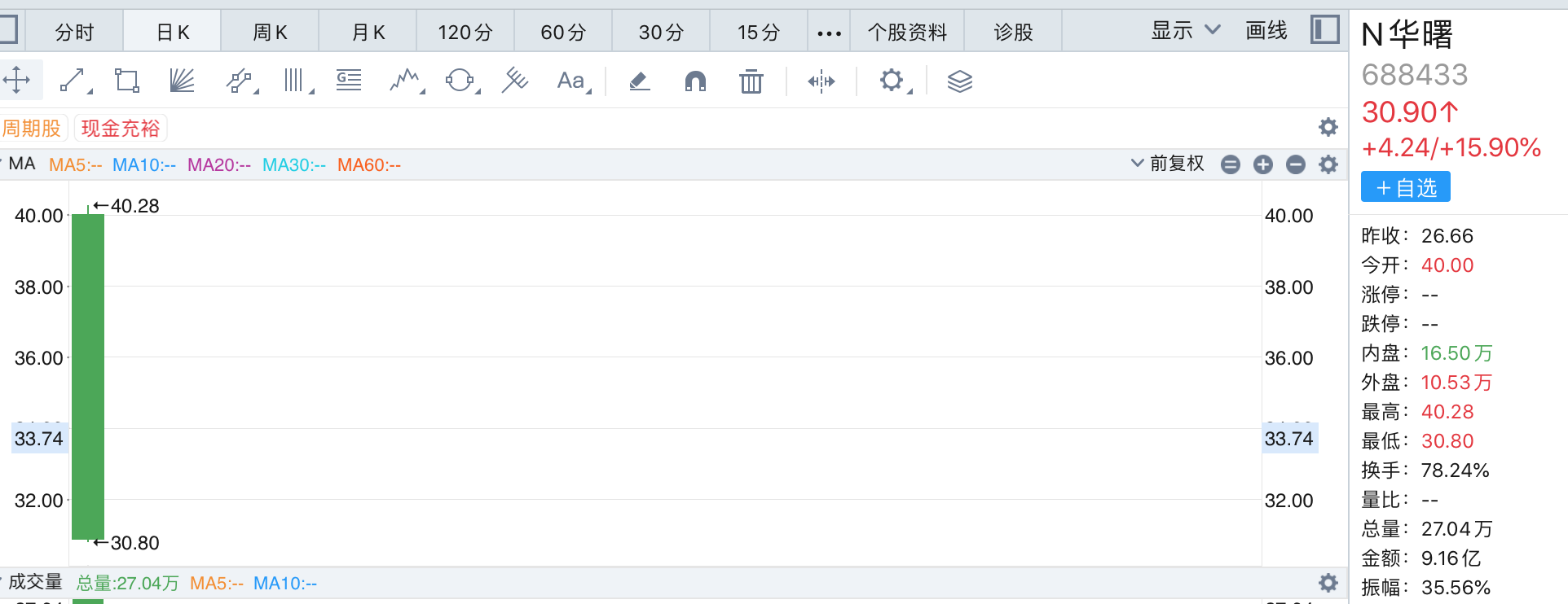 华曙高科已于4月17日完成A股登陆,盘面看,首日最高上摸40.28元,最低30.8元,收盘于30.9元,发行价为26.66元,首日表现为高开低走。