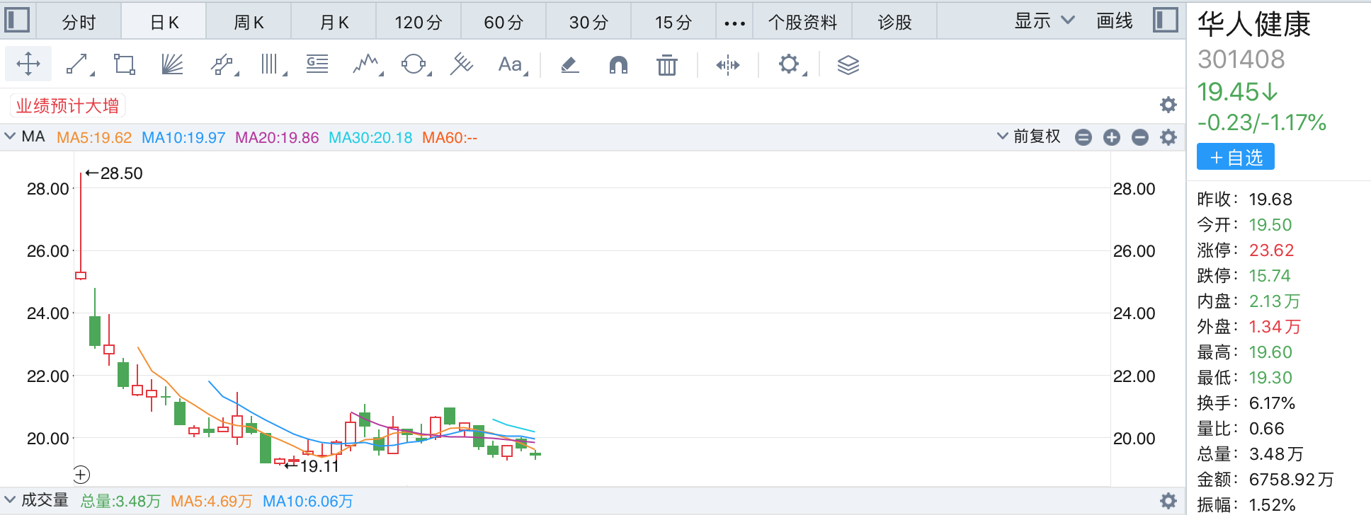 华人健康也是在首日上摸28.5元的高价记录之后,便连续走跌,截至4月17日收盘价格为19.45元,其发行价为16.24元。