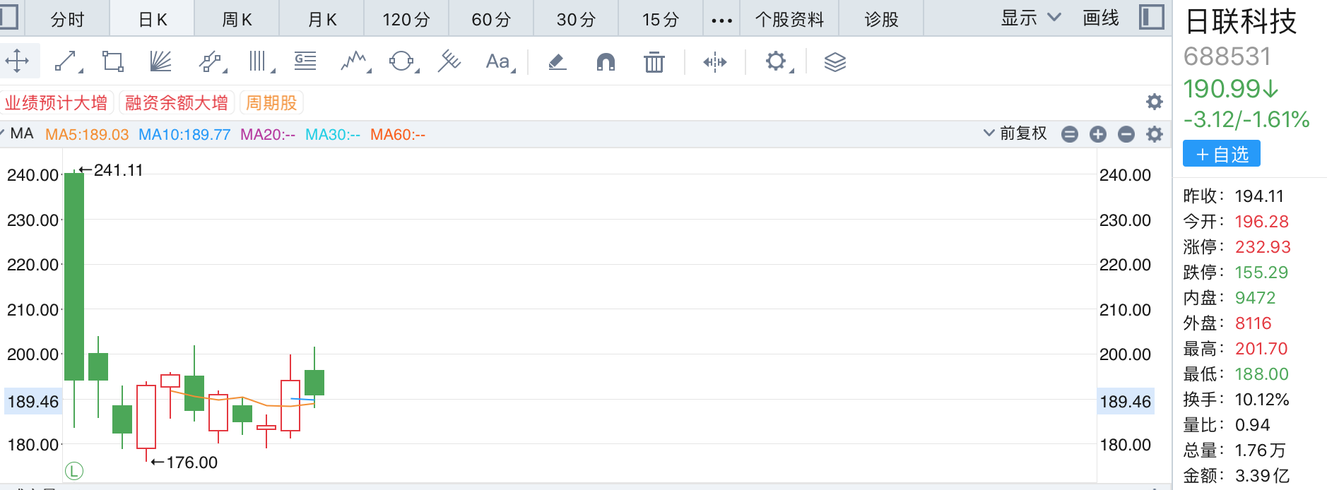 从盘面来看,日联科技首日最高上摸241.11元,虽然令瞬时打新收益数据可观,但其股价高开低走,画出了长阴K线,后几日的表现也显得萎靡,最低下摸176元,距离152.38元的发行价尚有距离。