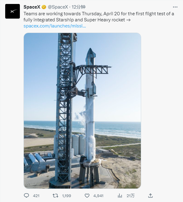 太空探索技术公司(SpaceX)当地时间4月17日宣布,该团队正在努力推进在4月20日星期四对“星舰”(Starship)进行首次飞行测试。