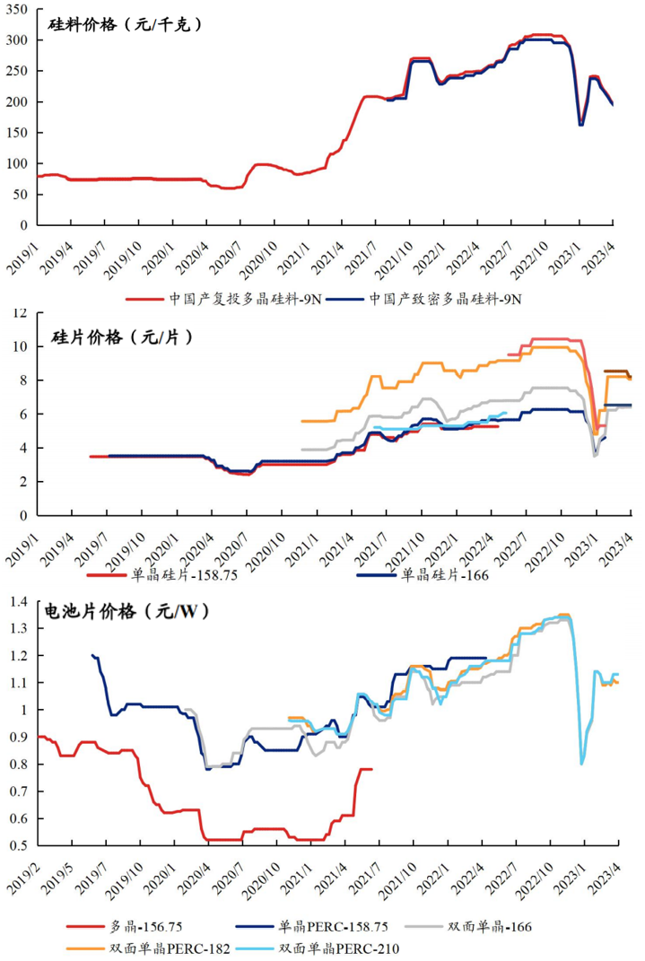 将自2019年初以来的硅料、硅片、电池的价格走势图放在一张图中,就会很清晰地发现,三者的曲线竟是如此高度一致。产业链价格的最低点发生在2020年中,最高点发生在2022年第三季度。