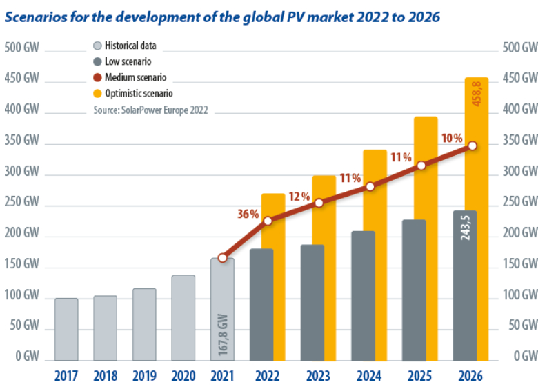 中国光伏行业协会名誉理事长王勃华预计,2023年全球光伏新增装机规模保守预测为280GW,乐观预测为330GW。