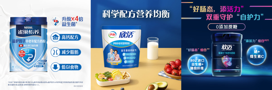 在主流的营养保健方向,则呈现出更加专业化的趋势,很多全球企业专门设立中老年相关的事业部或推出新品牌。雀巢成立了专注银发人群的品牌怡养,伊利推出了中老年奶粉品牌欣活,达能推出中老年营养食品品牌敢迈。