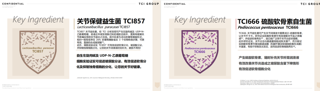 针对骨骼健康,大江生医从天然来源中分离出有助于关节保健的成分:关节保健益生菌 TCI857,能够促进玻尿酸分泌、有效促进软骨分化及抑制蚀骨细胞的分化;TC1666 硫酸软骨素自生菌,则是通过产生硫酸软骨素,有效促进软骨分化,并抑制发炎因子。