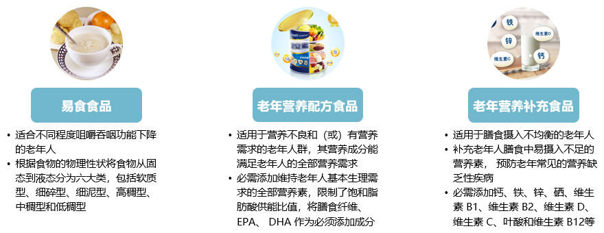 关于老年食品,卫健委于18年就发布了《食品安全国家标准老年食品通则》(征求意见稿),面向全社会征求反馈意见,对老年食品做了初步的定义以及细分品类的范围,主要包括易食食品、老年营养配方食品和老年营养补充食品。