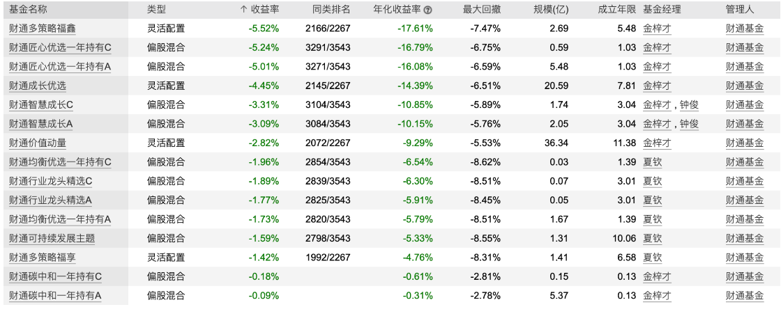 并且,进入2023年,金梓才管理的财通多策略福鑫(501046)、财通成长优选(001480)、财通智慧成长(A类:009062,C类:009063)均表现不佳,收益为负。