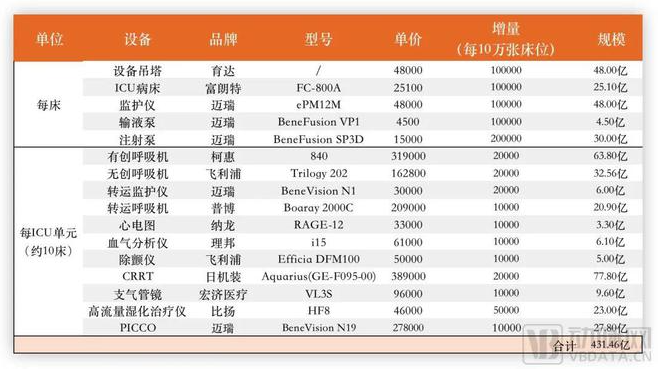 ICU建设带来的医疗设备增量,数据源自《综合ICU设备配置参考标准》、中国政府采购网