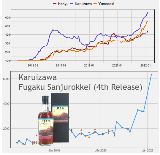 在2021年苏富比拍卖会上,日威的一瓶52年的轻井泽“12生肖鼠”1960年(Karuizawa52 yo 1960 Zodiac Rat Cask#5627)在伦敦苏富比拍卖行拍出了52.3万英镑的天价(约合人民币450万元),一瓶酒就能换中国一些大城市的一套房。