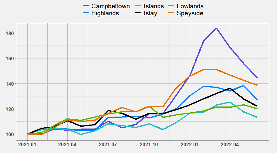 从2022年3月开始,主要几种苏格兰威士忌的价格指数开始陆续出现下滑