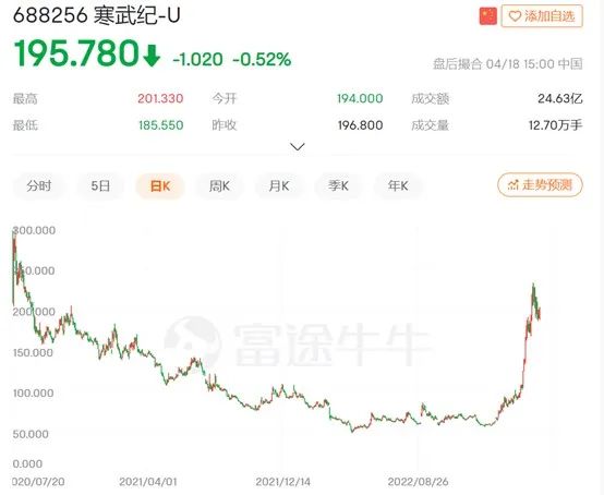 自2023年以来,寒武纪股价区间涨幅约260%,经过数天回调,截至4月18日收盘,寒武纪报195.78元/股,总市值811.74亿元。而在4月4日,寒武纪盘中股价一度达到230元/股,当日收报215.49元/股,相比开年的54.56元/股,累计涨幅近300%,总市值也达到864亿元,距离上市初的1200亿巅峰市值更近一步。