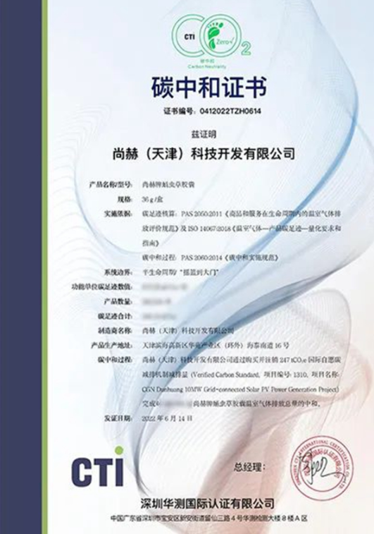 2022年6月,尚赫蛹虫草胶囊获得“碳中和”认证证书,该认证由中国合格评定国家认可委员会(CNAS)认可的第三方认证机构,按照国际通用标准,对尚赫牌蛹虫草胶囊的产品碳足迹(半生命周期)进行评价分析,尚赫蛹虫草胶囊也成为营养健康行业内首个获得“碳中和”认证的保健食品。