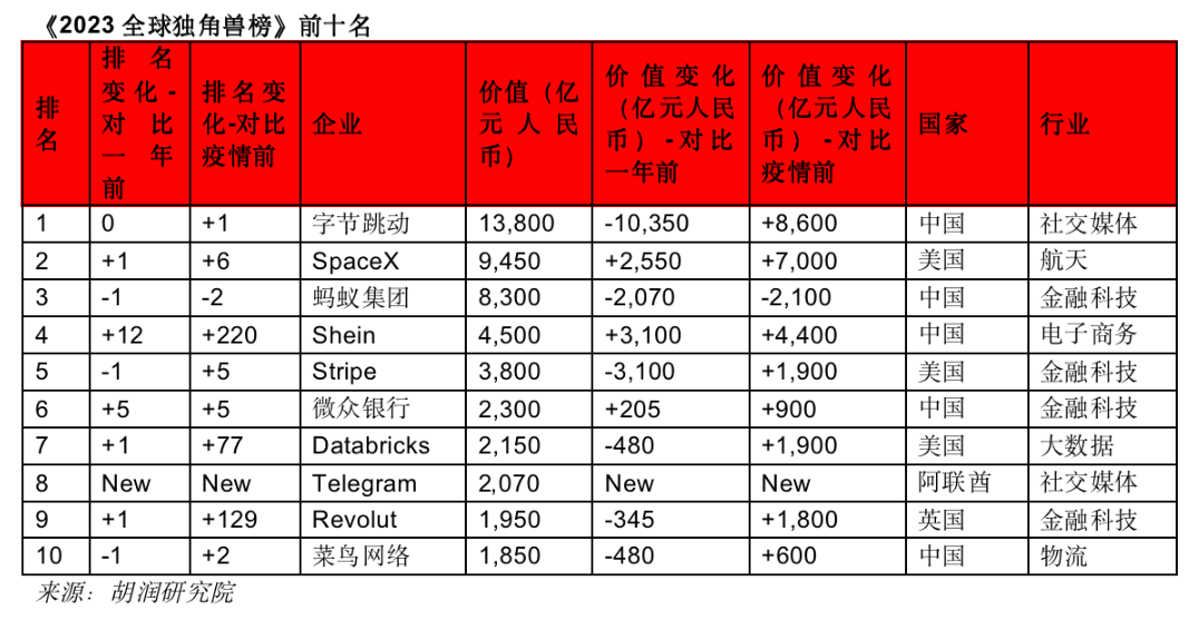 4月18日,胡润研究院于广州发布《2023全球独角兽榜》(Global Unicorn Index 2023),榜单估值计算的截止日期为2022年12月31日,列出了全球成立于2000年之后,价值10亿美元以上的非上市公司。