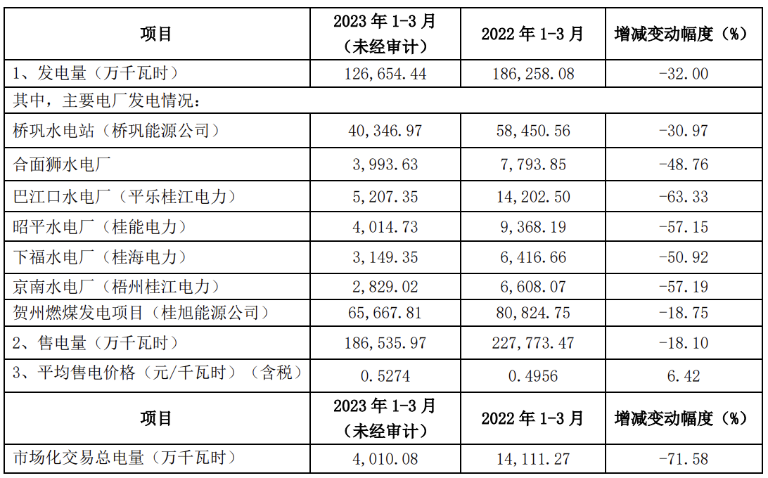 桂东电力:一季度发电量126654.44万千瓦时,同比下降32%