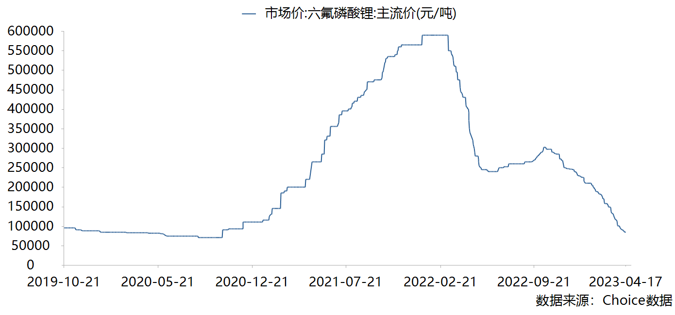 从深圳新星给出的节点2023年1月底算起,彼时六氟磷酸锂价格为20.75万元/吨,截至4月17日已经跌至8万元/吨,较2022年的60万元/吨的高位跌幅达87%。