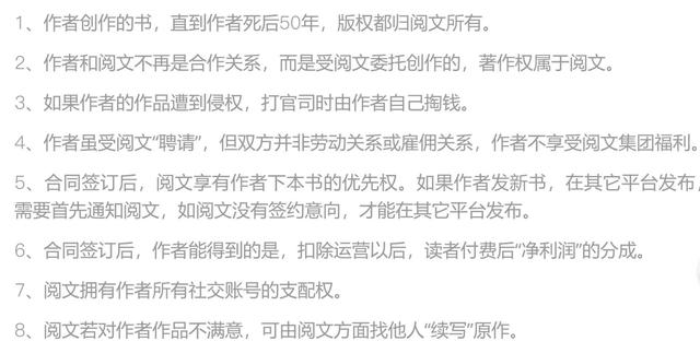 合同上要求:作者创作的书,直到作者死后50年,版权都归阅文所有;平台与作者之间的关系从合作关系调整为委托创作关系,也就是说,作者丧失对所写作品的著作权……