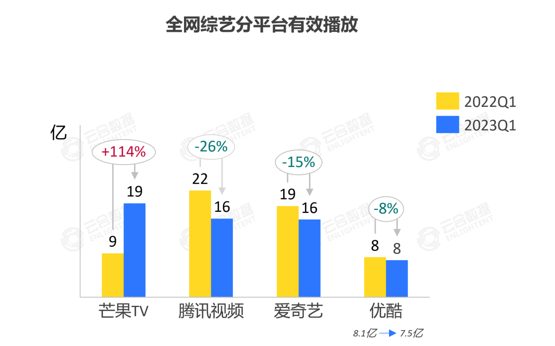 这种久违的提振所带来的乐观情绪,透过Q1的数据更容易理解。云合数据显示,2023年Q1全网综艺累计正片有效播放为60亿,同比上涨3%。但需要知道的是,这是建立在去年同期同比下滑33%的基础上。换言之,综艺市场仍在持续低迷,盛景难现。