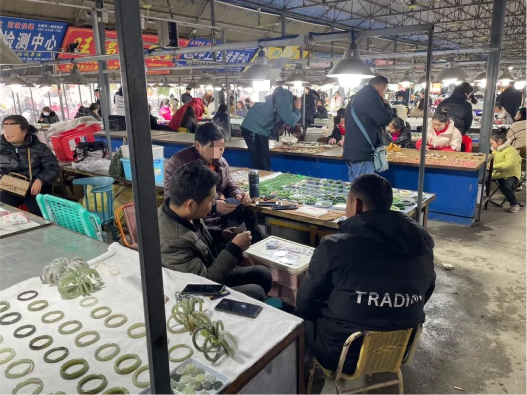 石佛寺人几乎生活在玉石批发市场里。有限的地理空间,被大大小小十多个玉石批发市场完全占满。当地人将这些批发市场分为四个类型,早早市、早市、上午市场和下午市场。其中早早市销售原石和板材,前些年货源充足时,新鲜的原料成为抢手货,谁赶在头排报上价才有机会拿到。神奇的是这样的交易也不是公开加价拍卖,而是靠着一种暗语现场一对一沟通。现在原材料供应被拉平,抢报价的必要性已经降低。