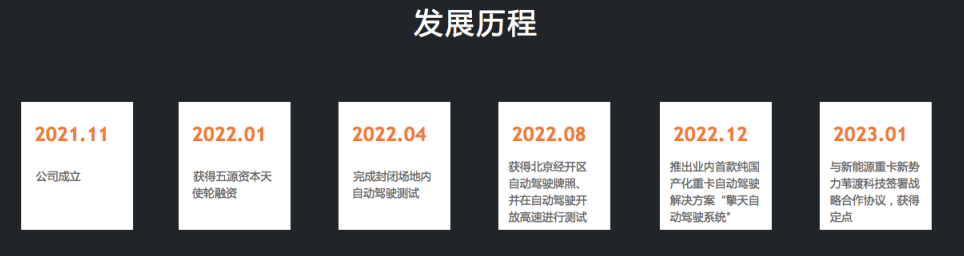 根据擎天智卡官网信息显示,擎天智卡2022年1月,获得同为小马智行投资人的五源资本的天使轮融资,2022年4月完成封闭场景内自动驾驶测试,去年8月获得北京市经开区自动驾驶牌照。在首页的中心位置:擎天智卡写道:行业最快L4产品和商业进展。此前,据品驾报道,有业内人士推测,可能引起侵犯商业机密争议的是擎天的研发周期。