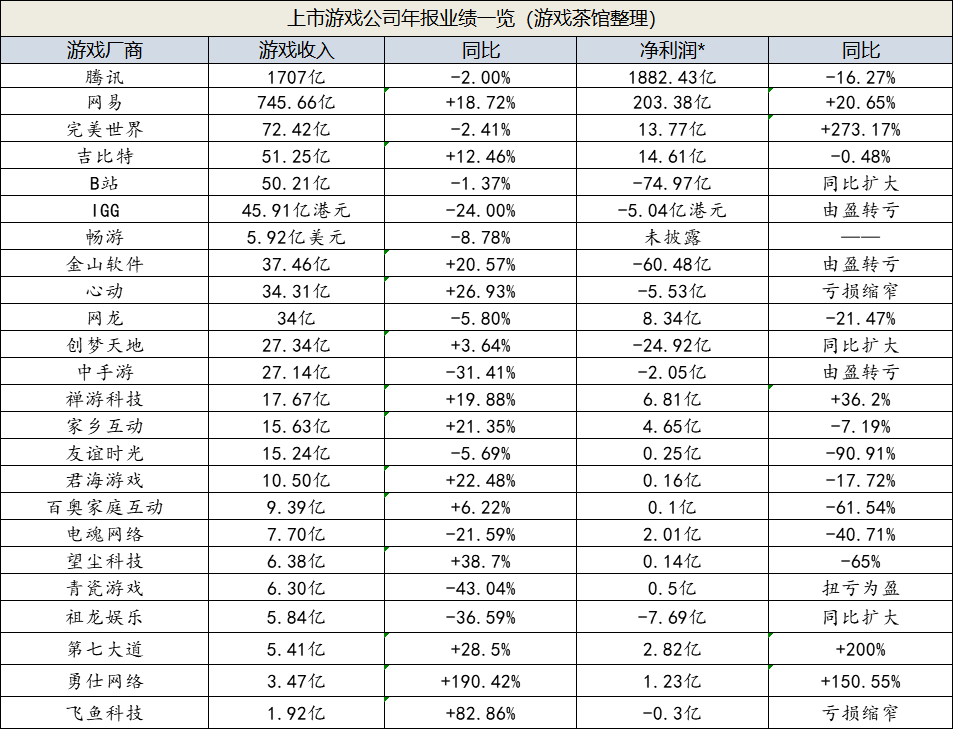 从上表可看到,去年亏损的游戏厂商不再少数。而一些勉强盈利的游戏厂商,往往还是营收、利润双降,去年行业有多惨真的无需多言。