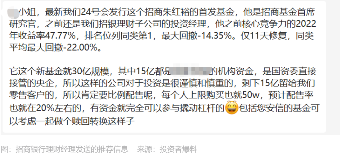 而招商银行的理财经理已经行动起来,鼓励投资者准备好资金“撬动杠杆”。日前,界面新闻记者收到投资者爆料,理财经理宣称“该基金的配售比例大约是20%”。