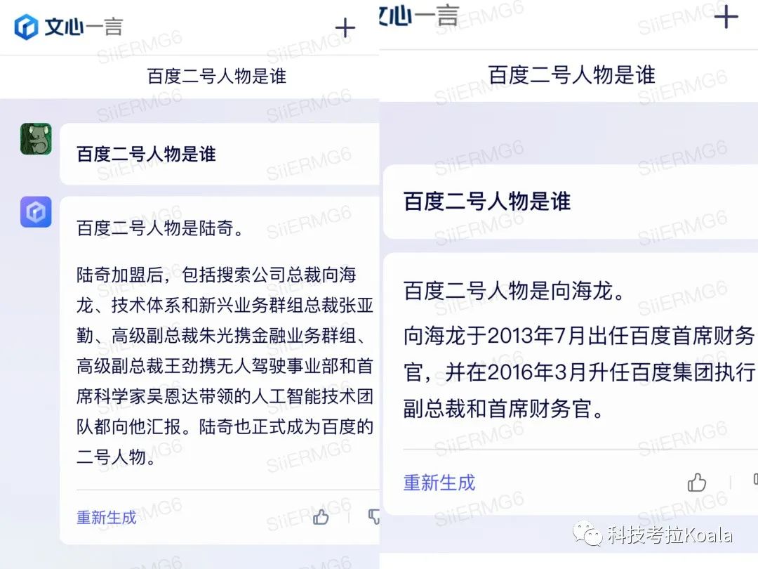 有点尴尬的是,当我询问文心一言“百度二号人物是谁”时,它先后给出的2个回答,分别是向海龙和陆奇。这二位从百度离开,已经分别是4年前和5年前的事情了。