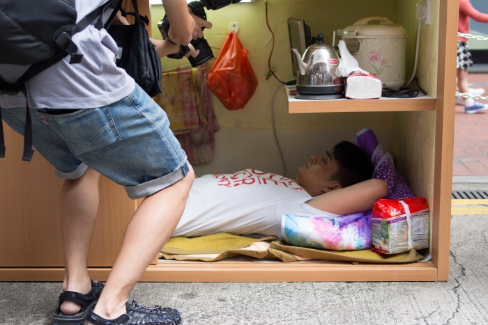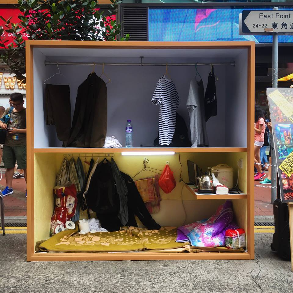 香港社区组织协会成立于1972年,是一个致力于帮助基层弱势人群的非营利组织。10月2日,在世界居所日来临之际,他们将一个占地面积只有约15呎的衣柜下层改造成“麻雀虽小,五脏俱全”的居住空间,再放置在人来人往的铜锣湾地铁站附近,邀请路人来亲身感受蜗居香港的压迫感。
